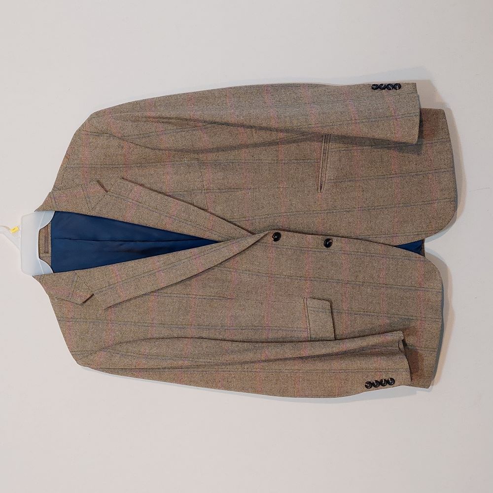 This is a preowned sport jacket for men in size 46R, a light brown herringbone tweed with overcheck pattern. FREE Shipping! $39.99