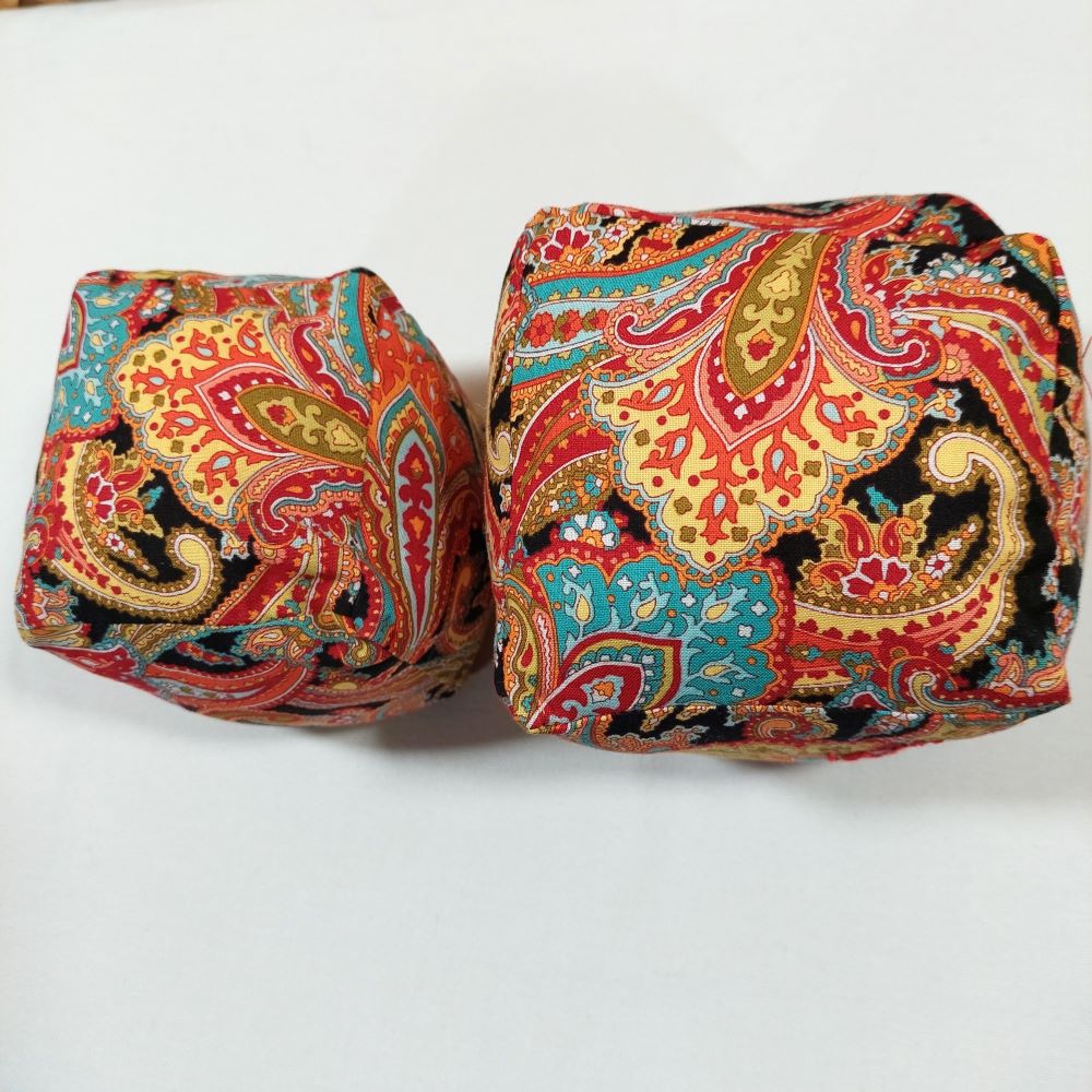 A pair of mini fabric pillow cubes, soft and lightweight. Cube 1 is approximately 3-1/2" each side and Cube 2 is 4-1/2" each side. For ages 13 years and older. Available for purchase at the MyWebYardSale Etsy Shop.
