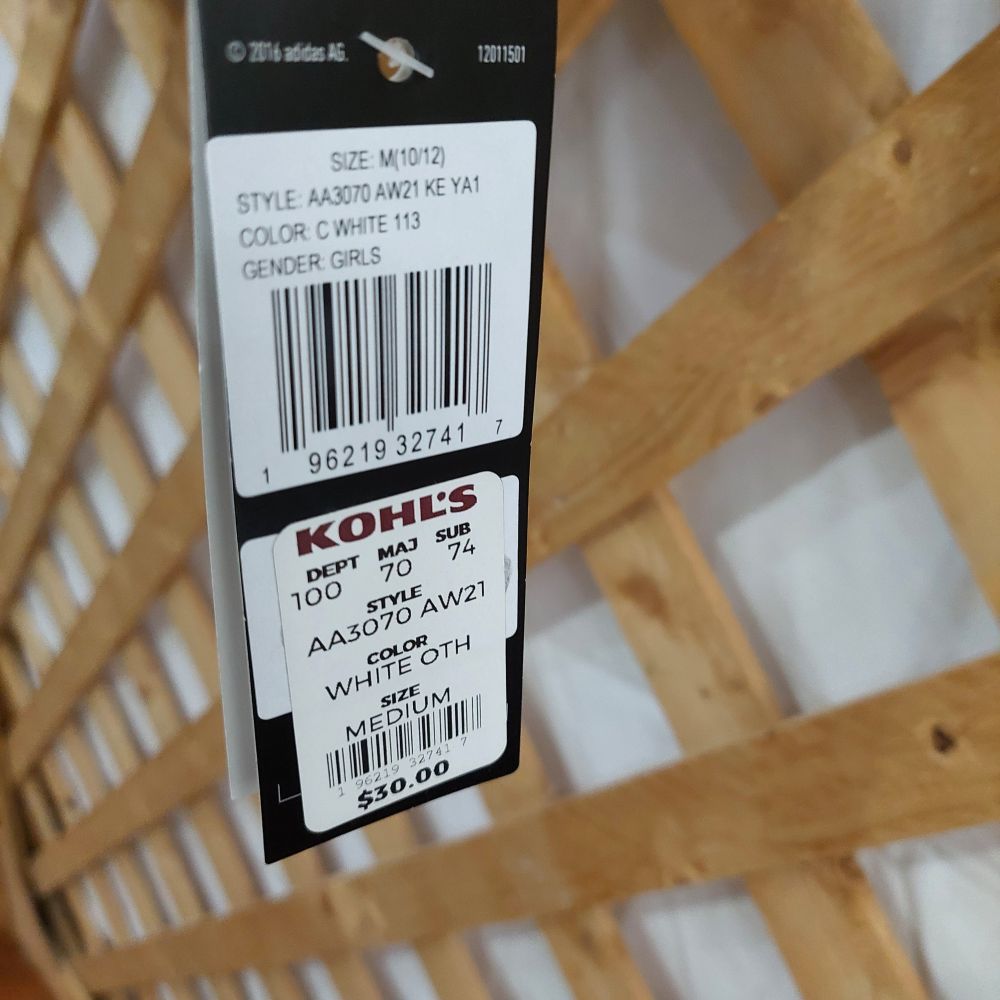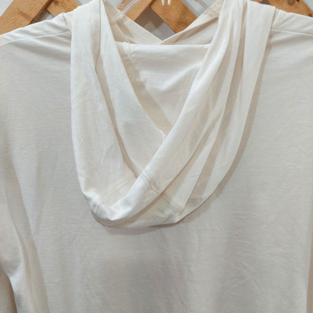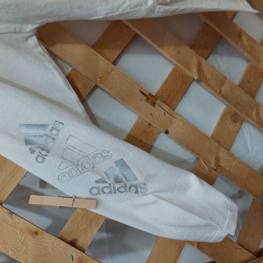 A creamy white 100% cotton long sleeve hooded t-shirt, Adidas brand, with the sales tags still attached. It is a "Loose Fit" shirt with graphics on the front and on the arms. Approximate measurements are: width is 20-3/4"; front top to bottom is 21" and back top to bottom is 22-1/2". Women's Size Medium (10/12). Made in Vietnam. Circa 2016