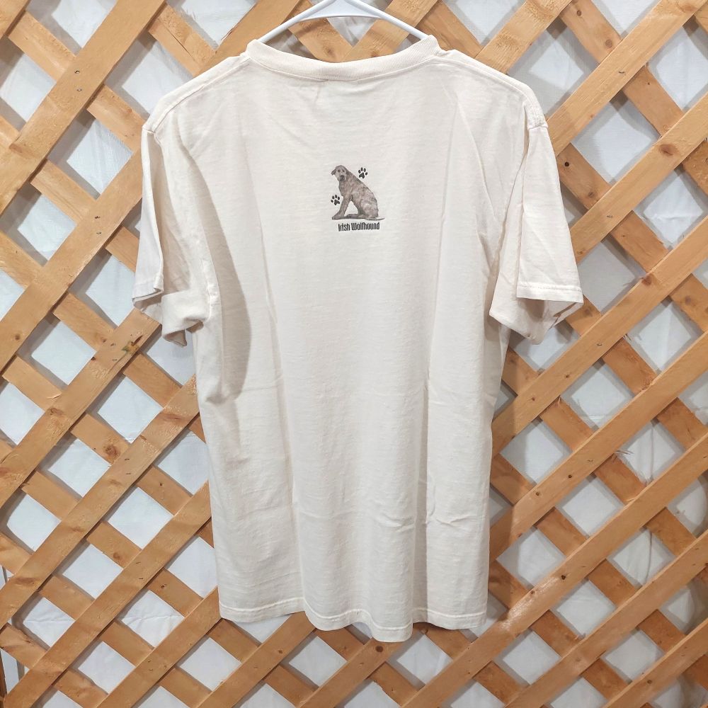A preowned Fruit of the Loom Heavy crewneck t-shirt with a large decal on the front of an Irish Wolfhound dog and the words "Irish Wolfhound" plus two paw prints. The same decal is on the back of t-shirt except that it is much smaller. The condition of the t-shirt is fair, there are no holes noted but there is evidence of pilling of fabric, cracking of the decal and a slight stain on the bottom hem. The shirt is 100% cotton, is off-white in color, with the decal colors to be black, grayish browns, and pink. Size is Adult Medium. Made in El Salvador of U.S.A. fabric. Possibly vintage.