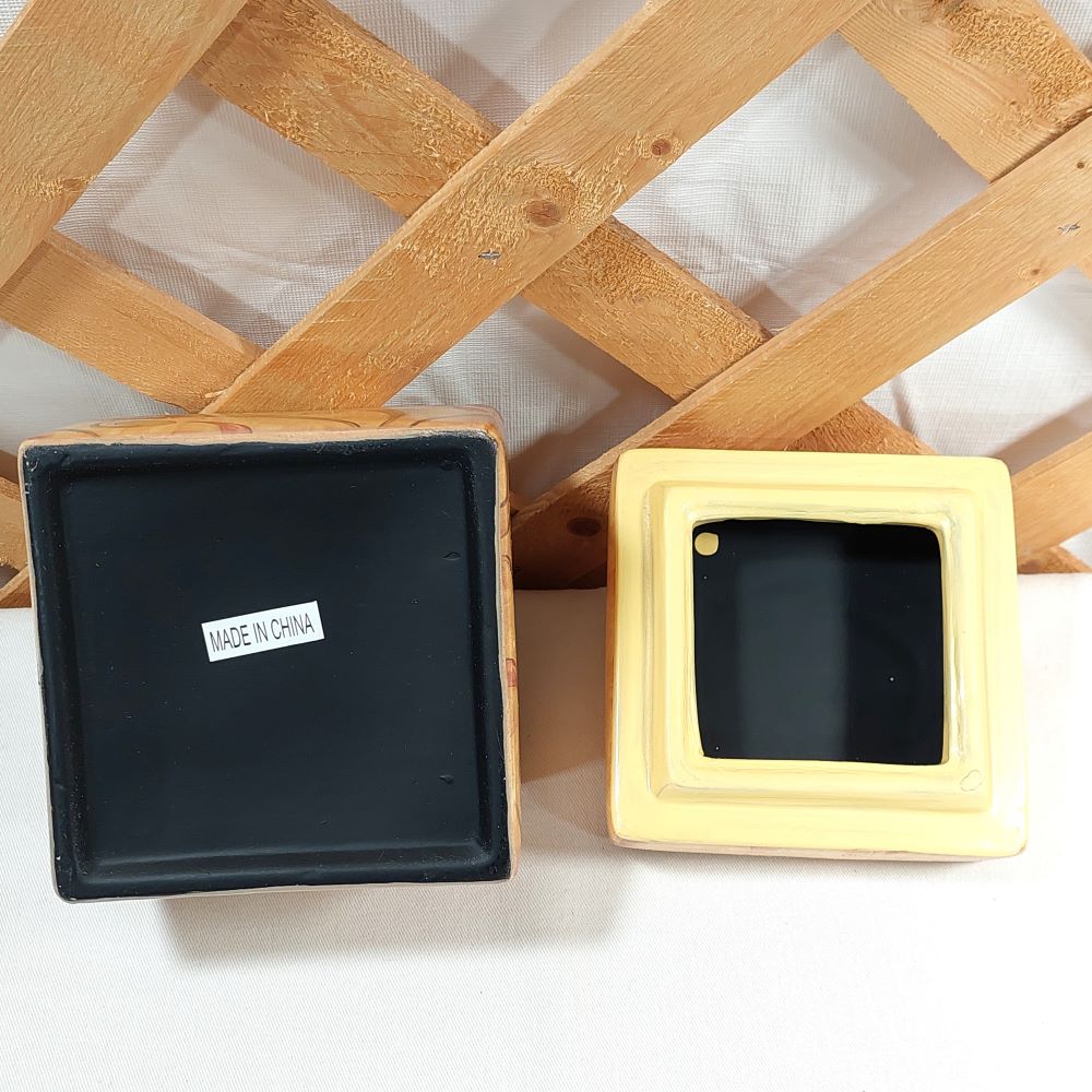 It is a square shaped porcelain box with a removable lid. The interior areas of the box and its lid are black with the exterior being a yellow color decorated with a floral pattern. The lid features a 3-D womens pump style shoe and writing that says "One shoe can change your life. Cinderella". The approximate measurements are as follows: the box with lid is 4-3/4" x 4-3/4" x 4-3/4"; the shoe adds 1-1/2" to the height of the box. The package and styrofoam are showing signs of wear. Made in China. Possibly vintage.