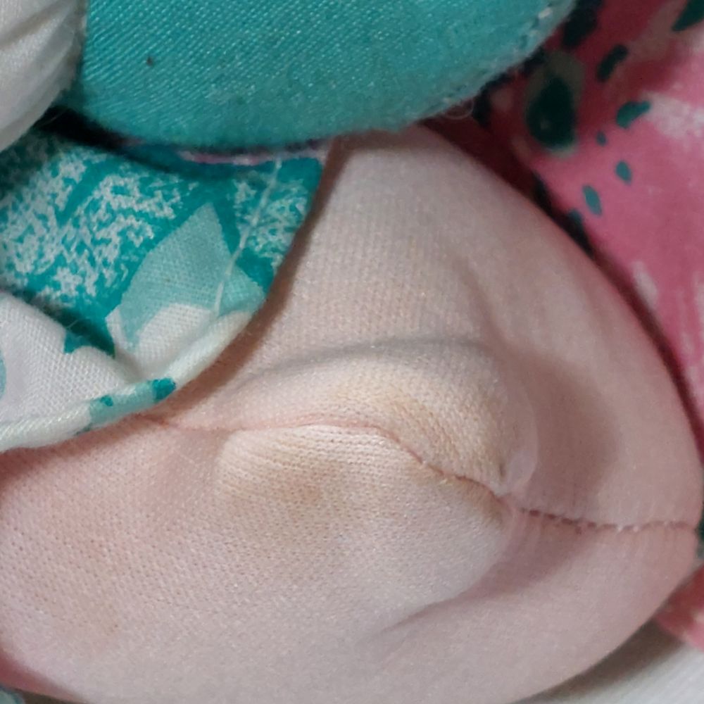 A preowned "Big Sister Little Sister Doll", with a small (9") doll attached to a large doll (30"), they have light yellow yarn for hair, both are wearing a dress and hat that is made of a cotton blend fabric. The large doll's braided pigtails have been unraveled, The faces feel like a polyester fabric, the larger doll's nose is a firm fabric ball sewn on the face. Brand is unknown. Pastel colors including peach, green, yellow, pink and white. Dolls are filled with polyester fibers. The dolls and their hats and dresses are made of a cotton blend fabric. The face feels like a polyester/nylon blend. The large doll's nose is a firm fabric ball attached onto the face. The eyes and eyebrows are sewn. Neither the clothes or hats are removable. Doll does not stand. The condition of the dolls are fair to good with some noticeable stains on the face, hands and legs, and the large dolls pigtails have been unraveled. Made in China.