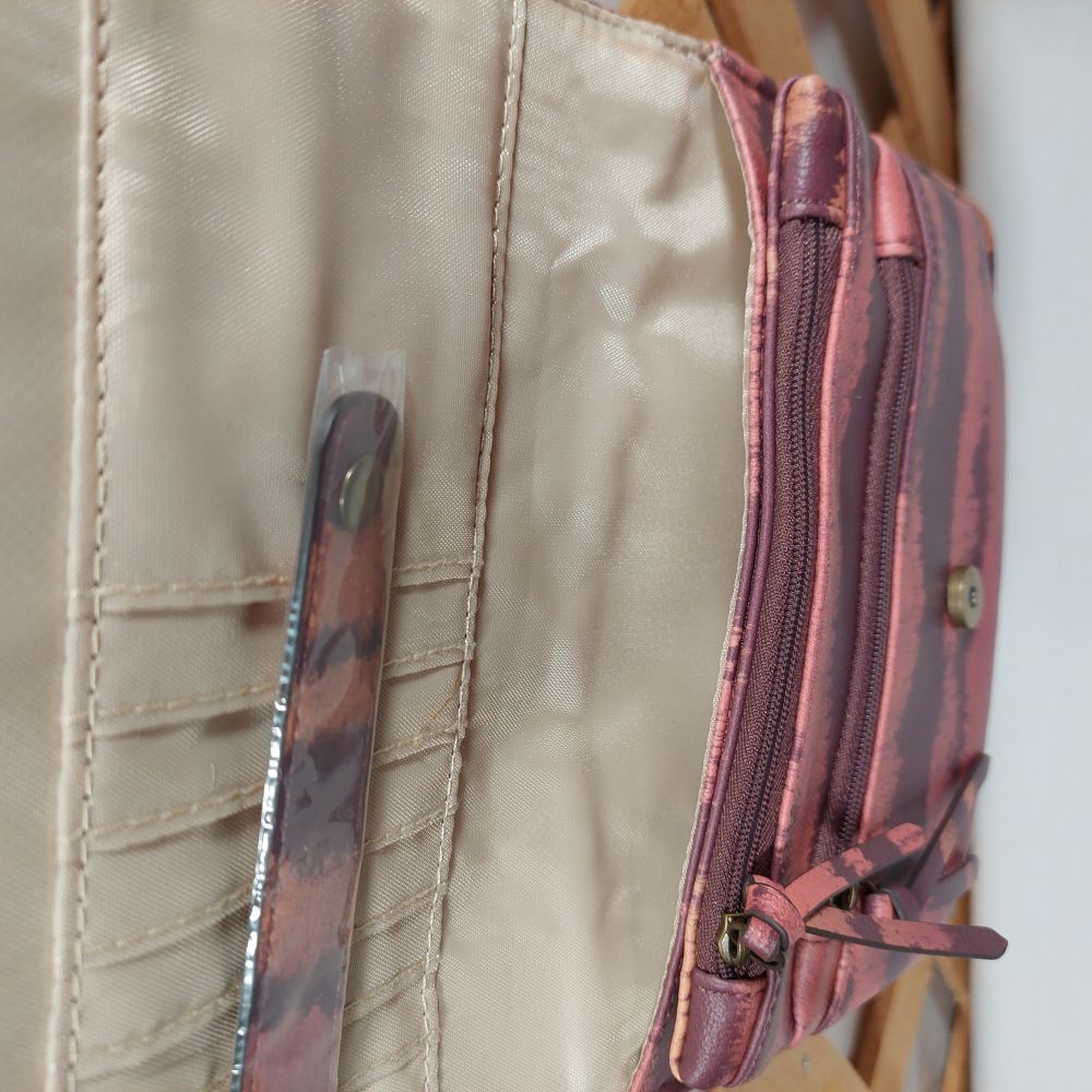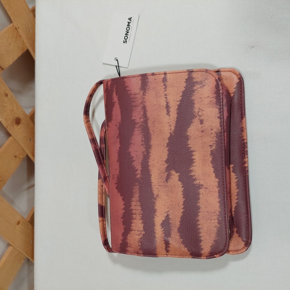 A crossbody wallet made from recycled materials giving it a "plastic feel", it still has the sales tags attached. The colors in the pattern are pinks, peach and dark purple. The product information states that the wallet has "Safe Keeper RFID-blocking technology. Under the outer flap there are 2 zip pockets and an open pocket as well as credit card slots. Approximate measurements are: 7-3/4" wide; strap extends 27" from wallet. Condition of bag/wallet is good, the product sales tag is stained.